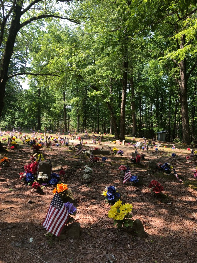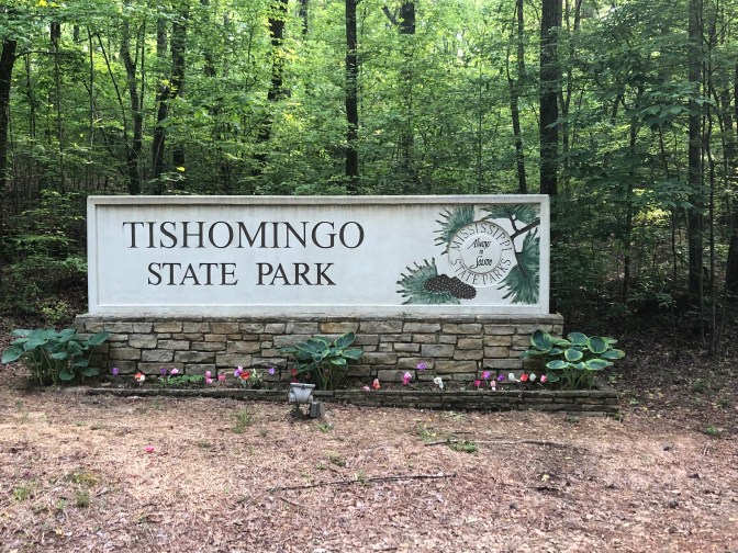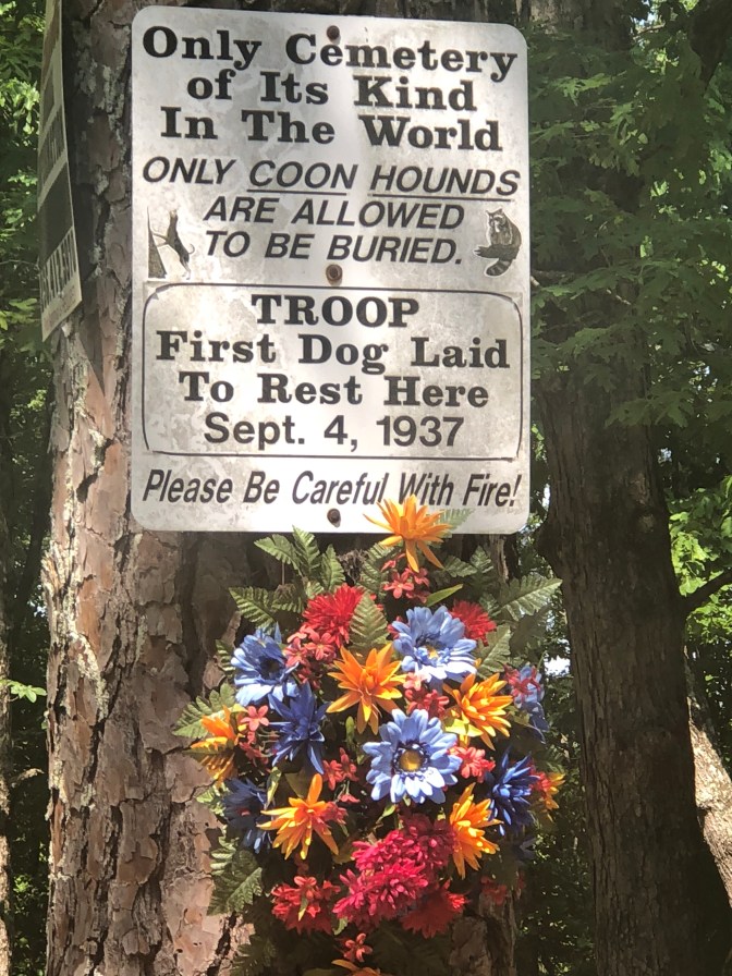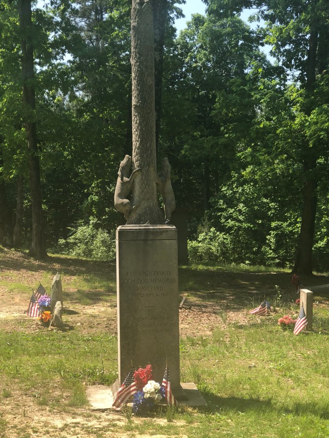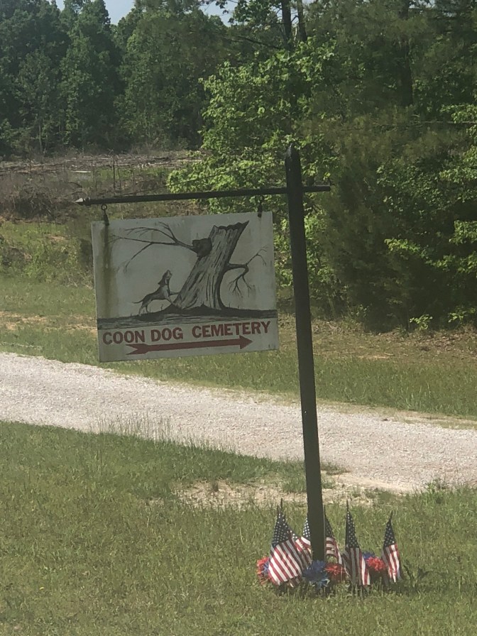 Tishomingo is named after a Chickasaw chief. He received a metal from President George Washington for service in the Revolutionary War and was later moved to a reservation in Oklahoma. The town was also mentioned in O Brother Where Art Thou movie. The Natchez Trace Parkway was beautiful and forces you to slow down and enjoy a quiet drive. ( 50 mph. speed limit) They have convenient rest areas all along the way. Our Vilano RV will be coming back with slide toppers and a swivel to the tv. The workshop has sites so that’s where we stayed the night. There is a brand new Texmex restaurant in town that was really good. It’s 68 glorious degrees today! We headed first to Tishomingo State park. Beautiful trails, old cabin, bridges( one that’s swinging), pool, playgroundS, cabins, camping, frisbee golf, lake with boat launch, pond, and not sure but river looks like a nice float ride. Great stop! Next stop was Coon Dog Cemetary in Cherokee, Alabama, just 22 miles away. To say these people love their dogs is an understatement. The first dog buried here was Troop in 1937. There are 5-15 people stop here every day and sign the guest register from as far away as Calf. and Canada. When I was a kid I remember one channel on our tv going off the air to the song ”Blue” and it would show a dog treeing