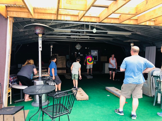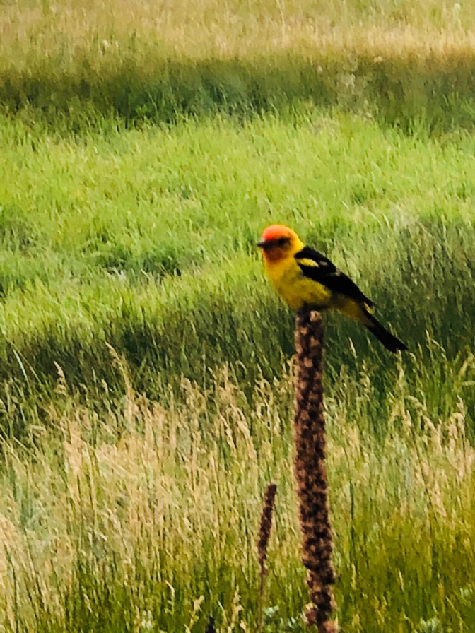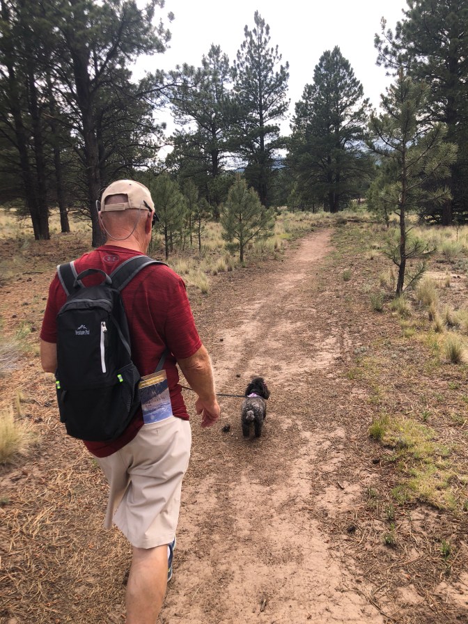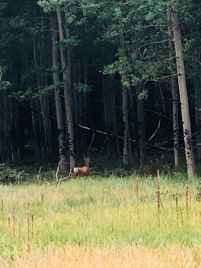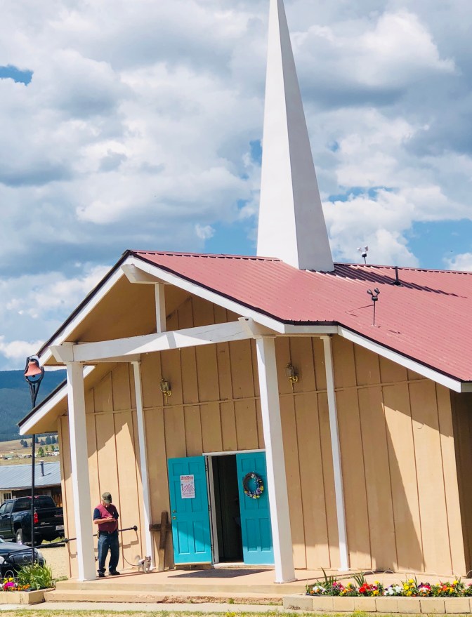 when we got out of our truck the pastor was standing outside and yelled “Praise the Lord”. There were 66 people and 2 dogs 🐕 there. (All over the age of 60 and No children) We sang At the Cross, Revive us Again, and Just a Closer Walk with Thee. The pastor and his wife were 2 of the 5 leading praise with 2 guitars and a set of drums. Everyone wore cowboy boots and Not the square toe kind but the working kind. The message was on repentance and It Was Good! Before we left we circled the sanctuary and held hands and sang I’m so glad I’m a Part of the Family of God. Still missed Bro. Mike’s message and the folks back home , though we have consistently found churches everywhere we go ,that love the Lord. Washer toss and free ice cream back at the camp. ( Gregg and I won even if our competition was two young boys) Have met great camp host and Pat and Dave and other couple David and Phyllis who were Texas Aggies like Gregg. Ended our day with a hike in Angel Fire on Elk Trail.