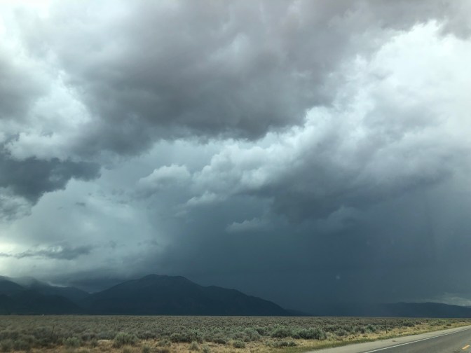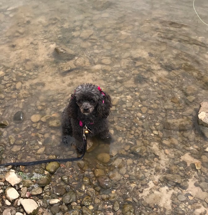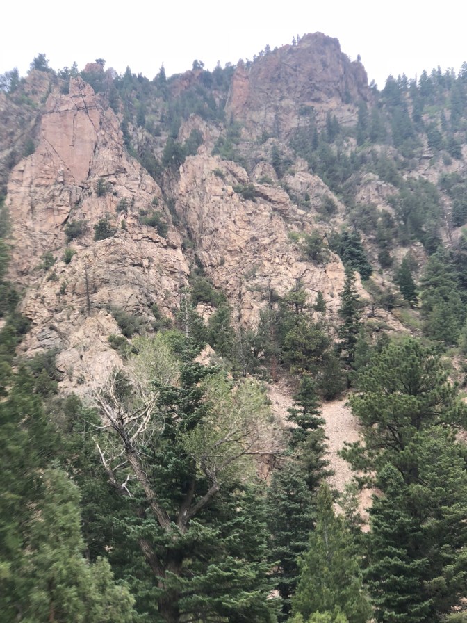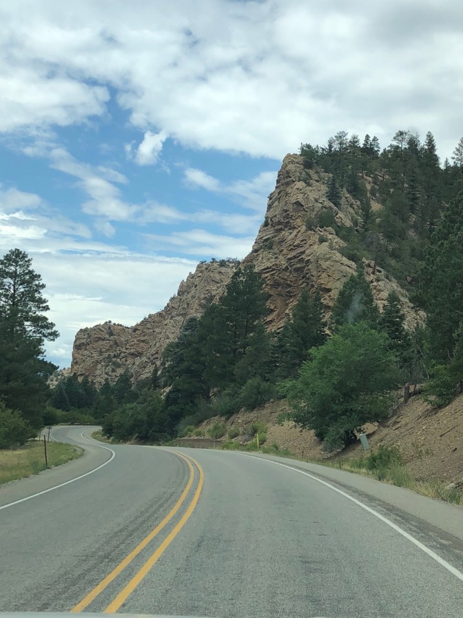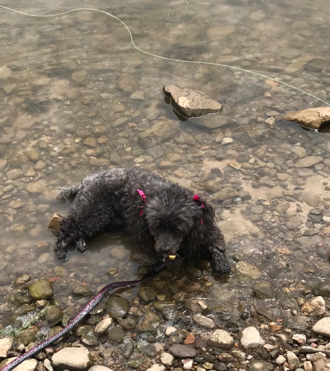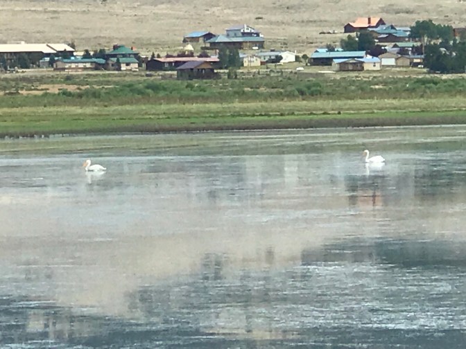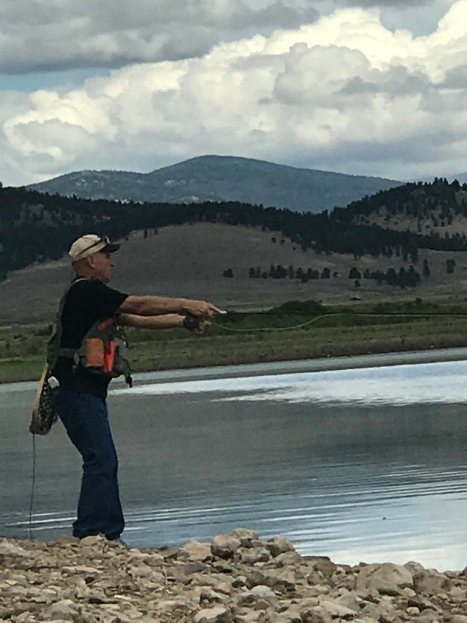 Quiet day in Eagles Nest. Went to fly shop and bought a 1 day fishing permit , some grasshoppers, yellow wooly buggers and midges, suggestions made by the young man behind the counter. It took me about 30 minutes to loose all of mine. There were trout jumping everywhere but on our hook but it was still a beautiful morning. Cameo surprised us by walking out into the water and deciding to lay down in it. We saw geese and white pelicans but pictures were pitiful. It rained most of afternoon which we can’t complain about because they need it here. It made the temperature around 71 while fishing ,before the rain , and the 60’s after it arrived.