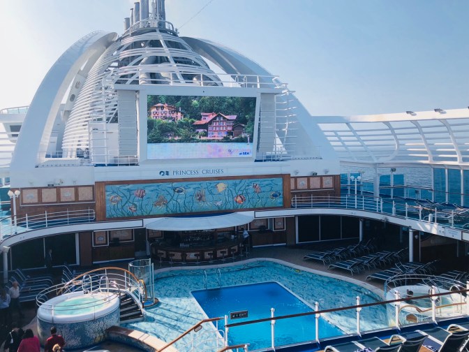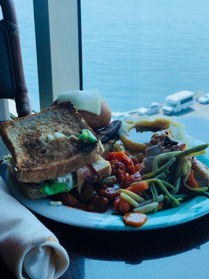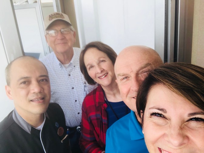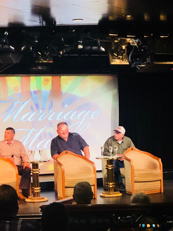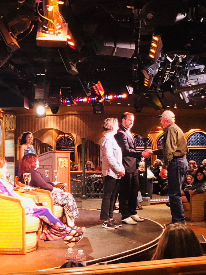 The weather has been perfect . Danny is our room steward, he is from the Philippines. We watched a great show, a comedian, took line dance lessons , and then went to watch the Marriage Game. I coerced Wayne and Marcia into playing, after all they’ve been 50 years. They were hilarious. They won!!! I ate my favorite , fish/ chips on shore. We played trivia games with other passengers.