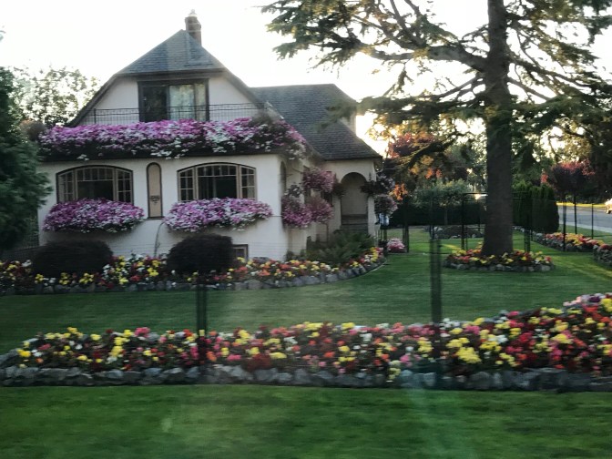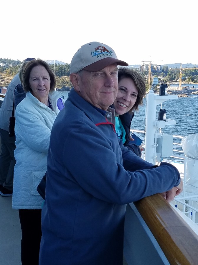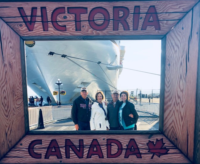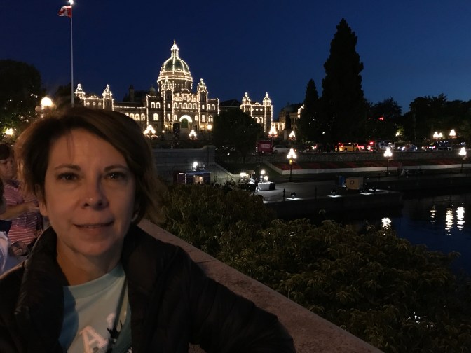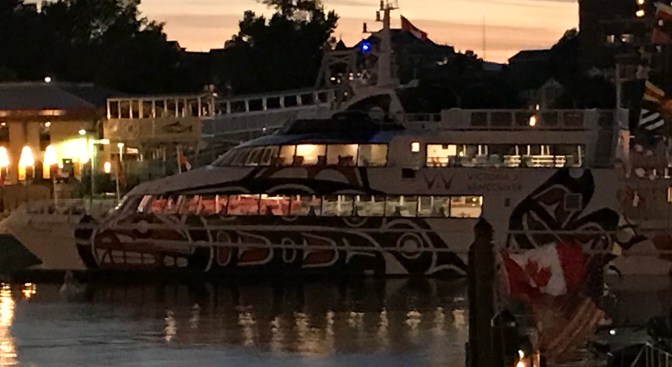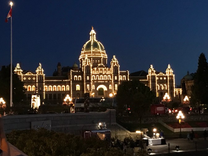 Free morning , watching whales, eating ( again) and playing dominos on the ship. Been covered in blankets and wearing our insulators. Boy are we going to have temperature shock when we get back! Went to Victoria for a night tour. The town is beautiful. I didn’t realize it was an island. The White House with black shutters is Tom Selleck’s House. They have many of the buildings like the Legislative House lit up at night with 3,330 lights the same amount as the number of jewels in the Queen’s crown. We took pictures from Mount Tolmie of the city. They have the tallest totem pole (127 ft.) in the world at Beacon Hill Park.