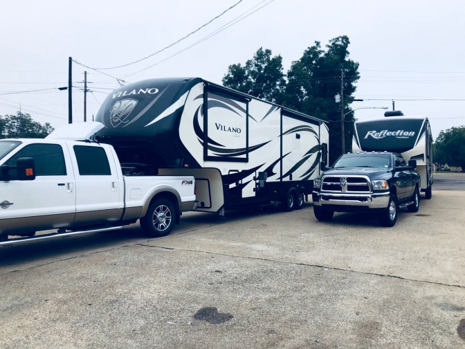Hooked up, prayed for safe travel and headed out this morning. The sun is not up yet but we are bright eyed and bushy tailed. We’ve got 10 hours of travel before we hit Wichita, Kansas for the night. That’s if the Lord says the same. Gregg added a wind deflector to the top of truck. Suppose to save up to 3 mpg. And keep bugs off front of RV. We will be reporting on how well it works.