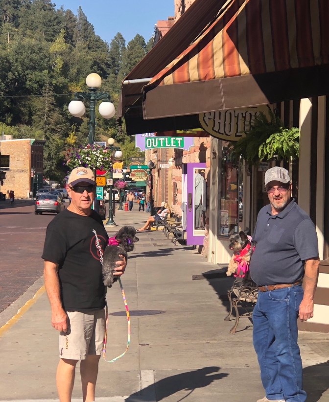 I loved the architecture of the downtown Deadwood. It was also where Wild Bill Hickock was killed. Now, if I were considering having a gunfight I think I’d call out the two guys carrying the pretty puppy dogs 🐕.