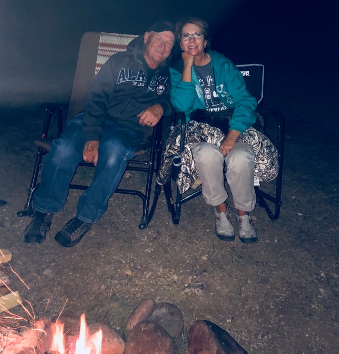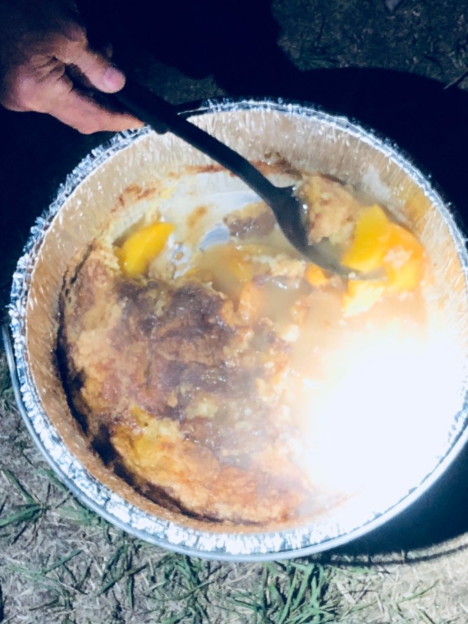 Fished late afternoon. Jackie caught 2 brown trout. One was about 14″, a nice one. No picture🙁. Sat by fire 🔥 and had Shish-kabobs and Dutch Oven peach cobbler.