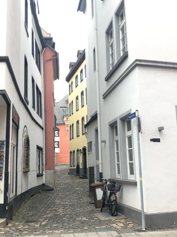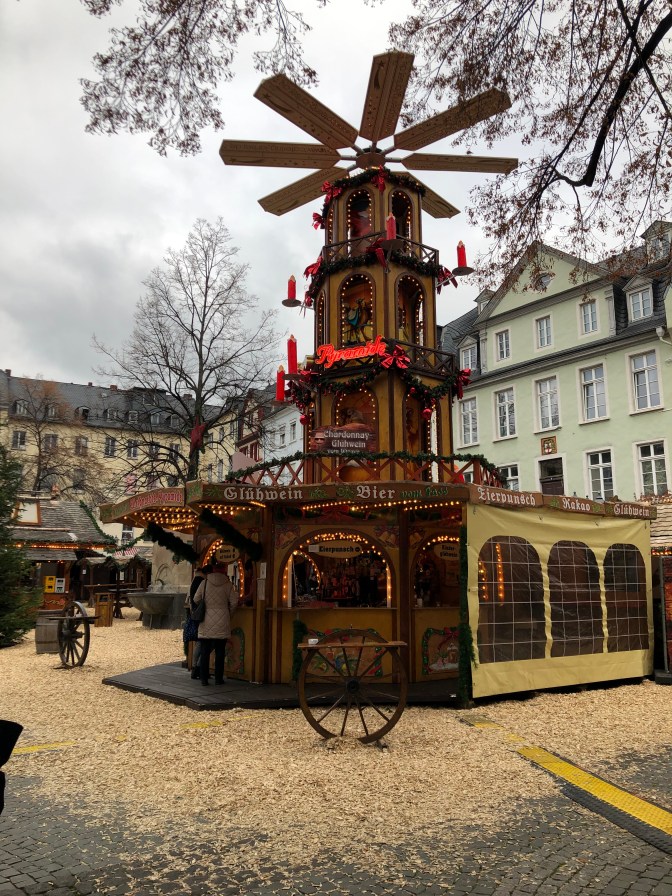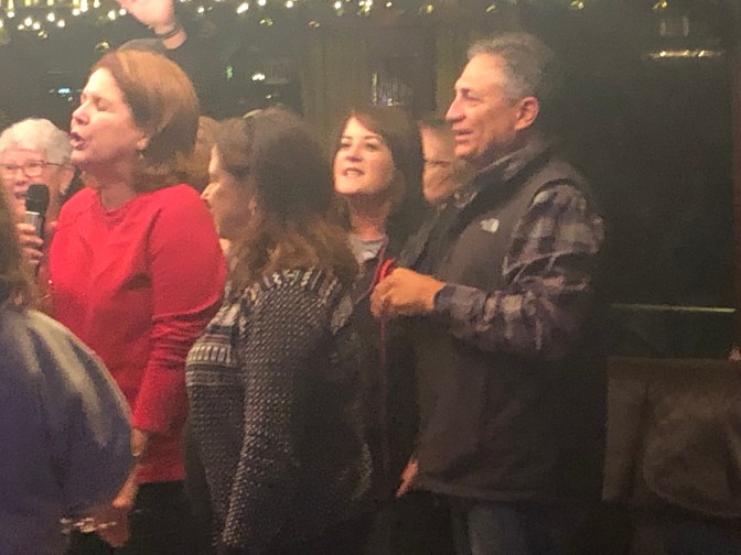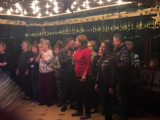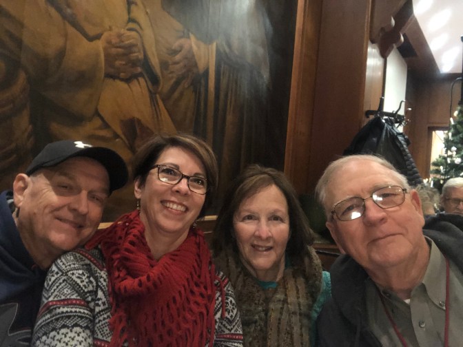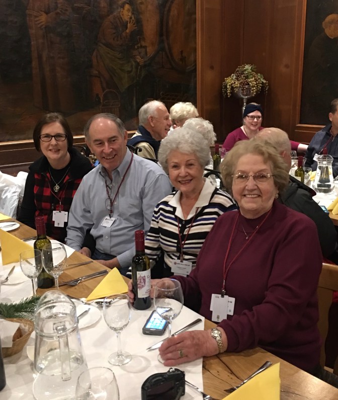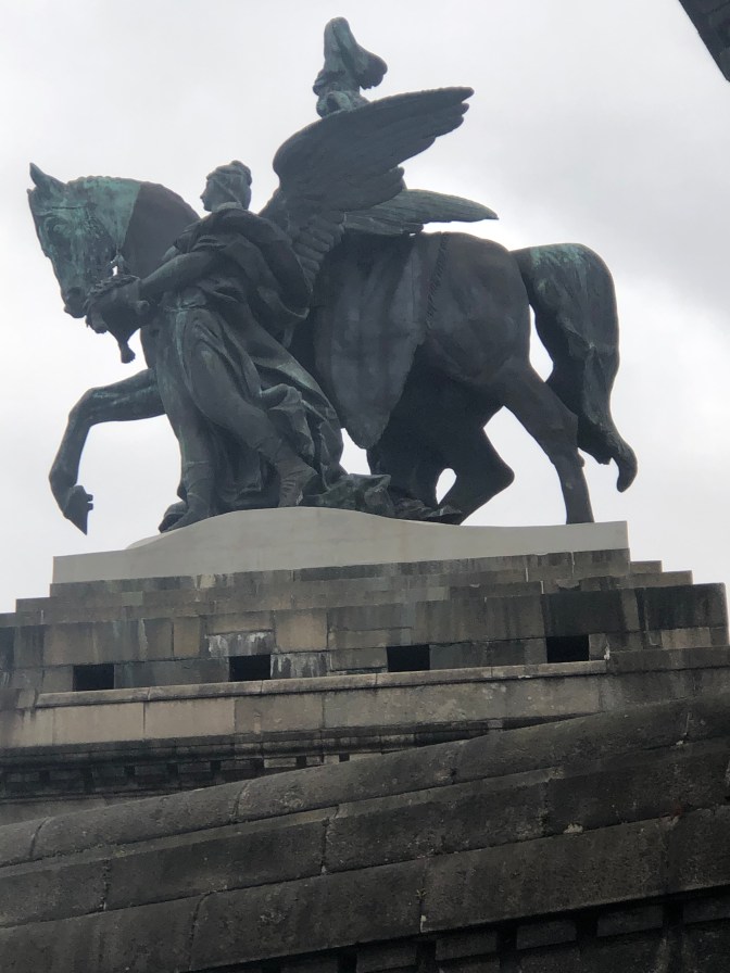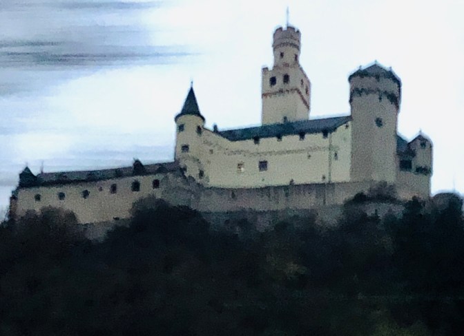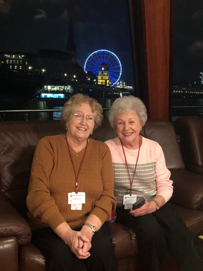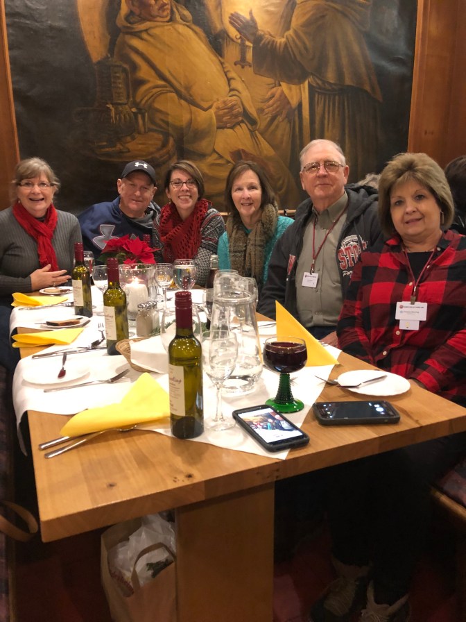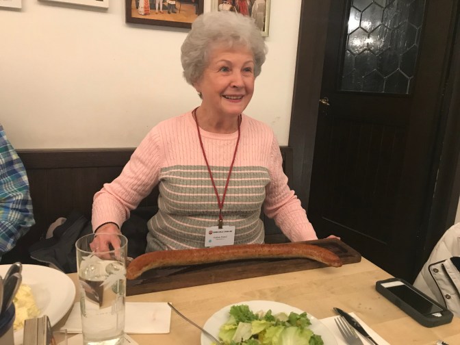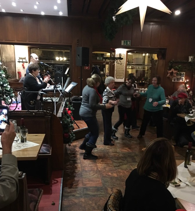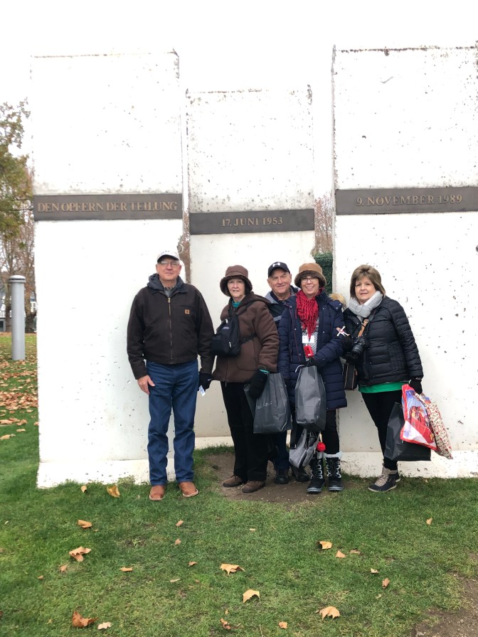 This was one of my favorite days. Love the “blue” group and Rebecca. Murray led is “Silent Night” for Karaoke Night. We got 100 points! ( oh yeah every group did. ๐ We took tours in town and went to Christmas Market. Wayne milked a cow. Gudrun and I had a blast dances and what do you think of that sausage?Stephanie and Ken are standing in front of 3 sections of the Berlin Wall. We passed where Lorelei (a fable) would cause the boats to crash.We ended the night with dinner and dancing at a restaurant.