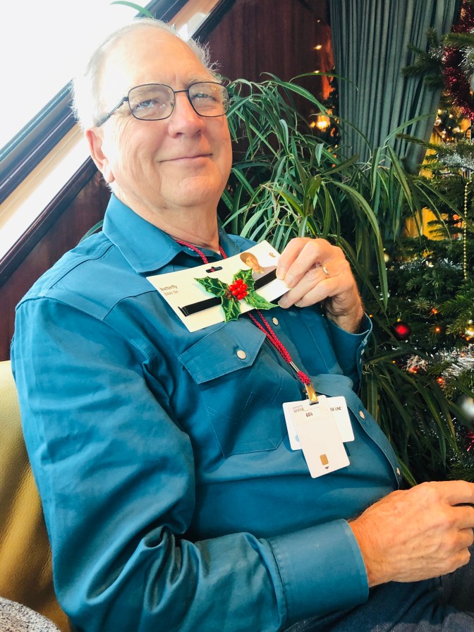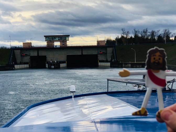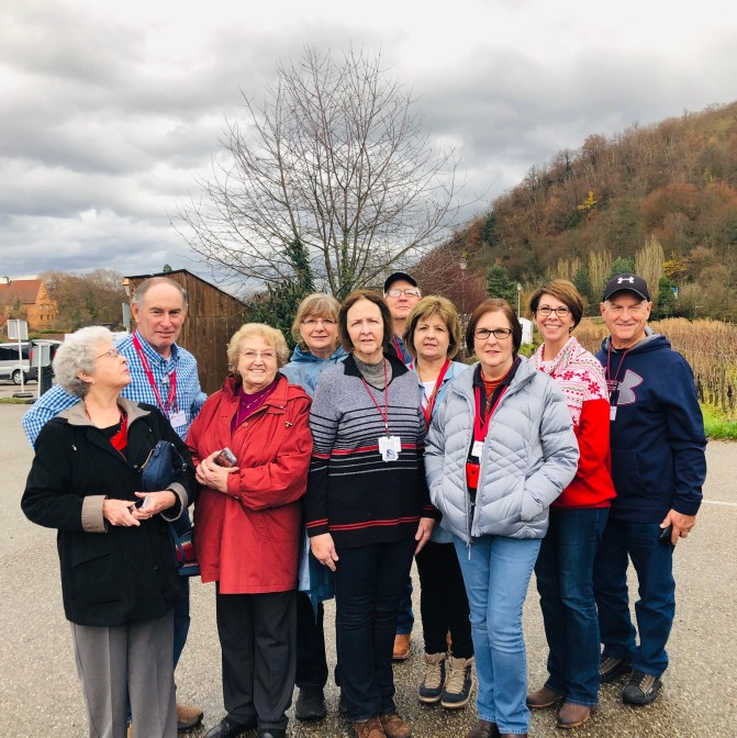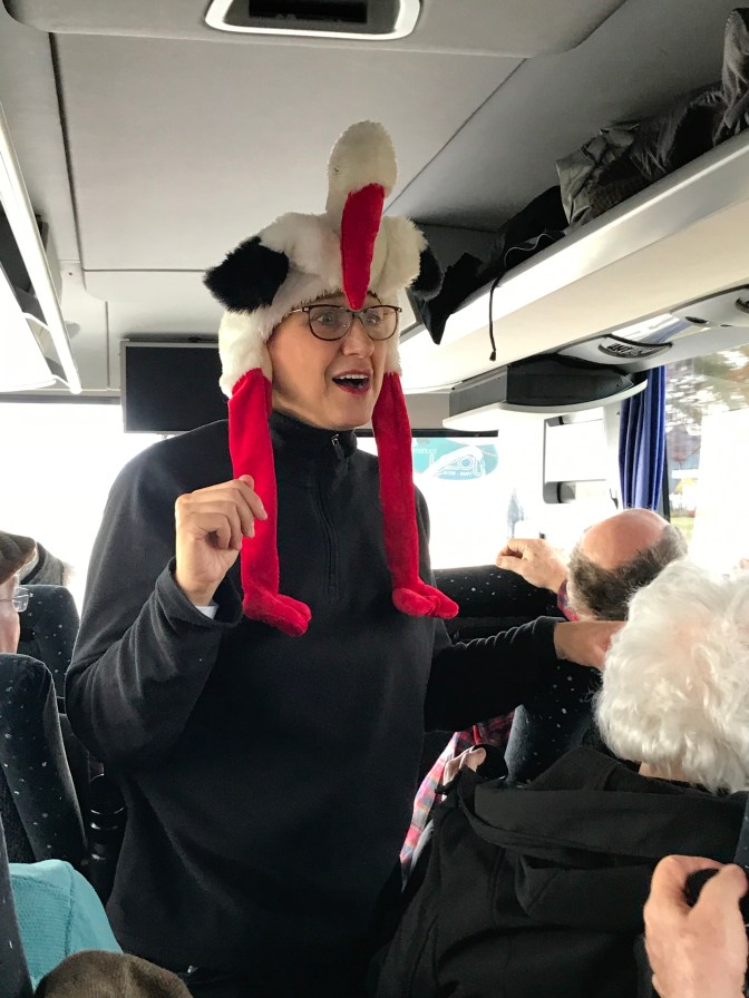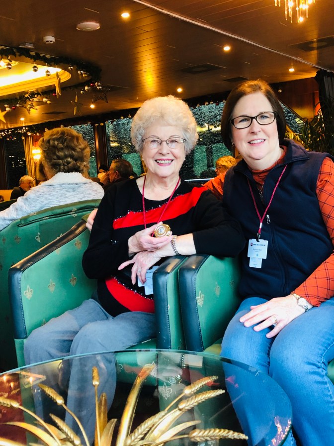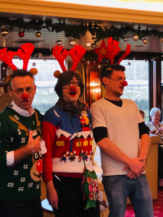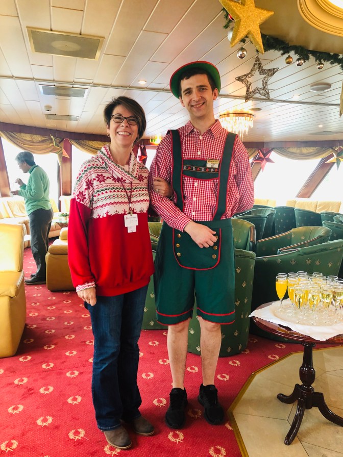 Our last day was really wonderful! We ate Flambé Torte. Rebecca our director loves hats so Duanna and I got her this one. Wayne won a prize for his Christmas story telling how he propose to Marcia in a box of cherries 🍒 . Guess who got to steer the boat 🚣♀️. Not me I got caught! That was one big fruit cake and wasn’t the waiter so cute in his Lederhosen outfit?