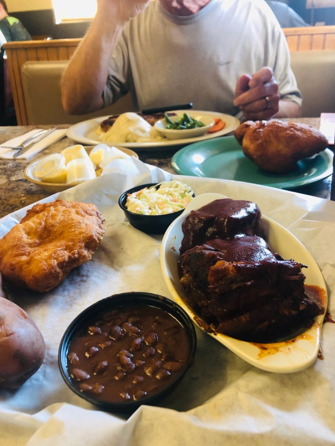 Also got a tip ( from Sheri and John)about eating barbecue ribs and fried bread at the Back Room. It was a huge delicious meal. Y’all that thing on the blue plate is like a fried biscuit. It was so tasty; didn’t say necessarily good for you but oh so tasty!